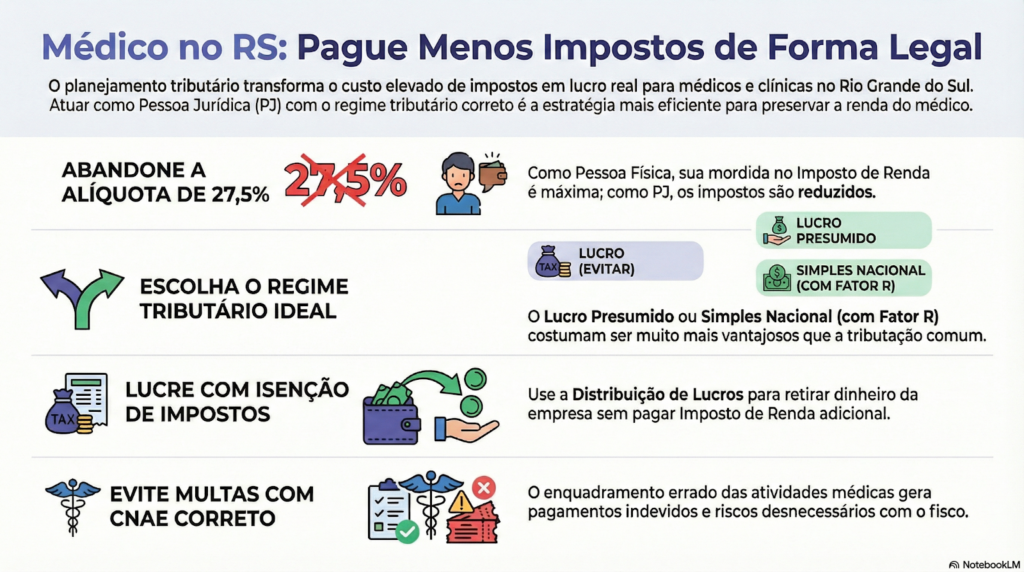 No planejamento tributário para médicos no RS, a migração para pessoa jurídica costuma ser um dos principais pontos de economia quando bem estruturada.